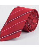 Прокат галстука красного цвета в белую полосу и разноцветной обводкой для мужского костюма